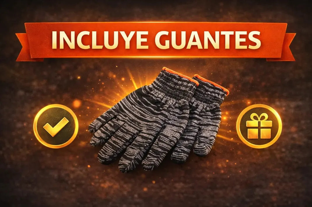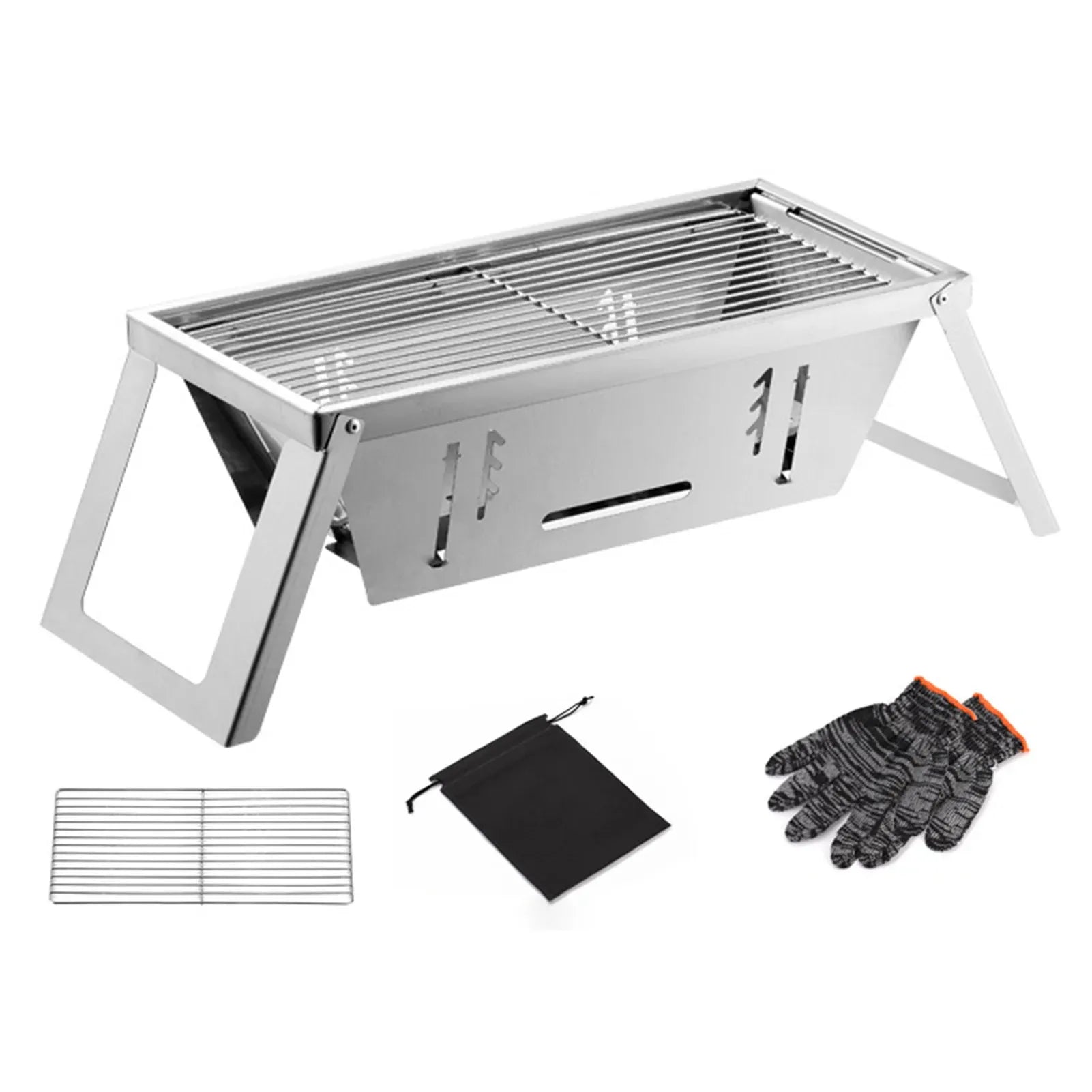 Incluye la parrilla plegable completa y un par de guantes resistentes al calor para mayor seguridad al manipularla.