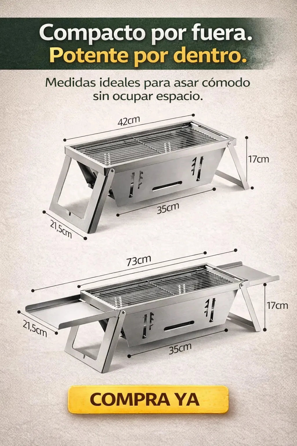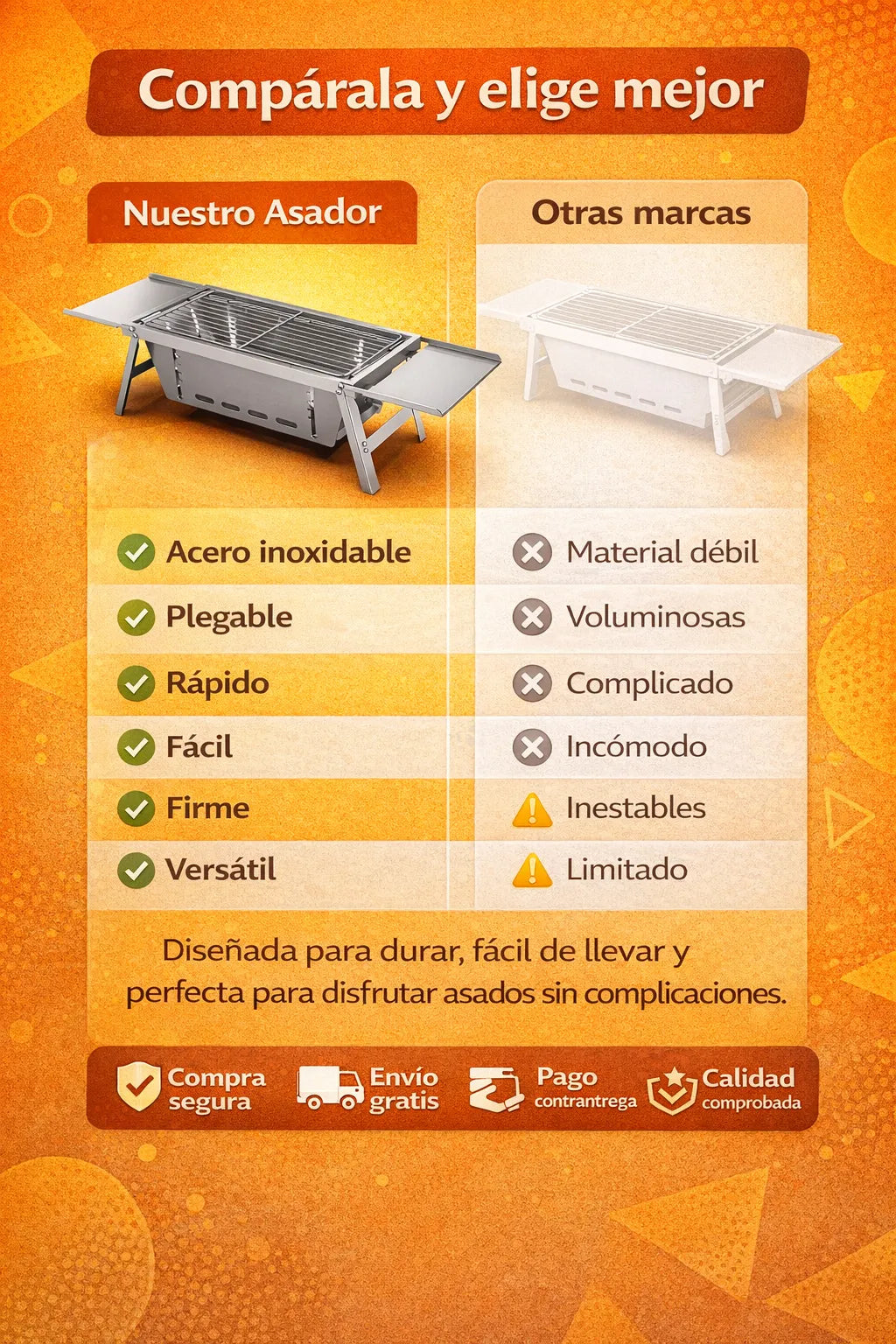 Vivas en un departamento, te encante el camping o armar reuniones, esta parrilla es tu aliada. Asás lo que quieras sin líos ni estorbos, y con lo que ahorrás en salidas... ¡se paga sola!